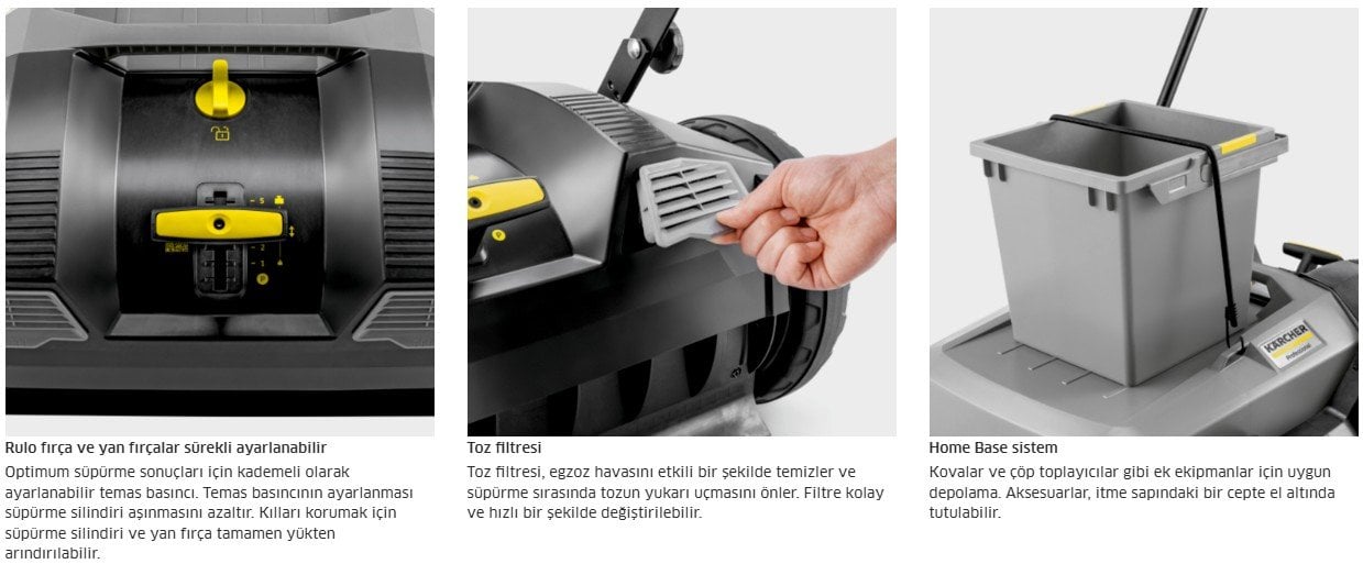 KM 70/20 C 2SB manuel süpürge, 2 yan fırça ve bir süpürme silindiri ile temizlik yapar. Manuel tahrik ile birlikte, iç ve dış alanların temizliği basit ve verimli hale gelir: KM 70/20 C 2SB'nin alan performansı bir süpürgeden 9 kat daha yüksektir. Süpürme silindiri 6 adımda ayarlanabilir ve kademesiz olarak değiştirilebilen yan fırçalarla birlikte farklı zeminlerde optimum temizlik sonucu elde edilir. Kullanılan filtre, süpürmeyi neredeyse tozsuz hale getirir. Yüksekliği ayarlanabilir itme kolu ve kovalar ve çöp toplayıcılar gibi ek ekipmanların taşınması için Home Base sistemi ergonomik bir kullanım sağlar. Bu, atıkların toz ve kirle birlikte tek bir adımda atılabileceği anlamına gelir. İş bittiğinde KM 70/20 C 2SB, park konumunda yer tasarrufu sağlayacak şekilde depolanabilir.